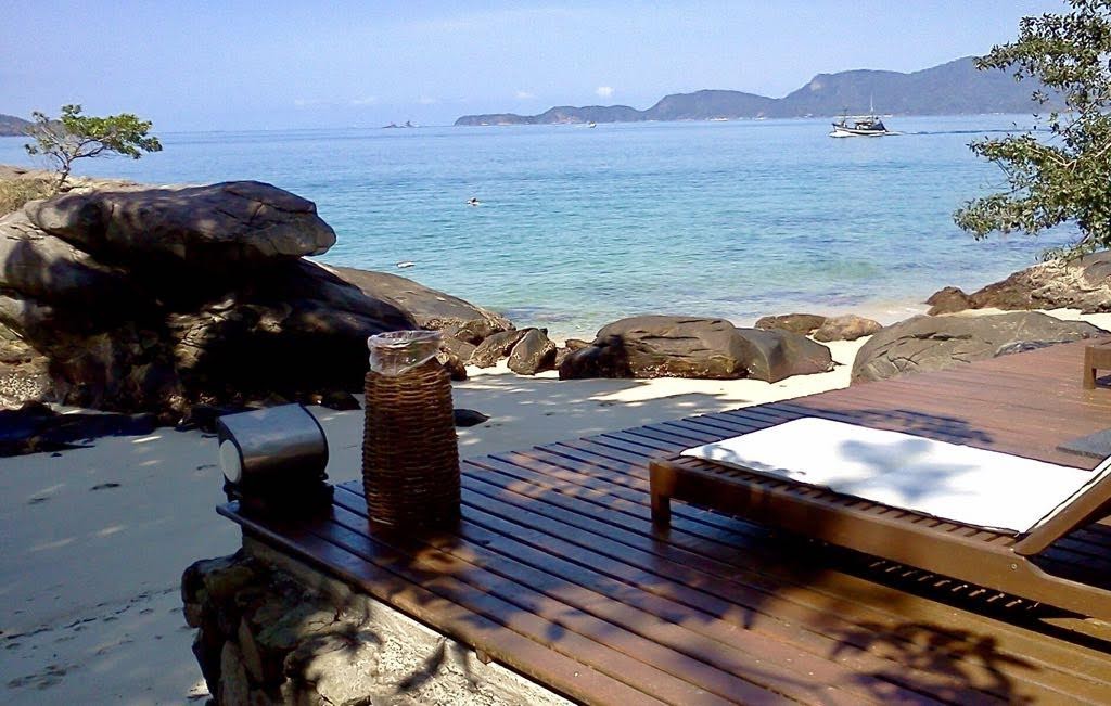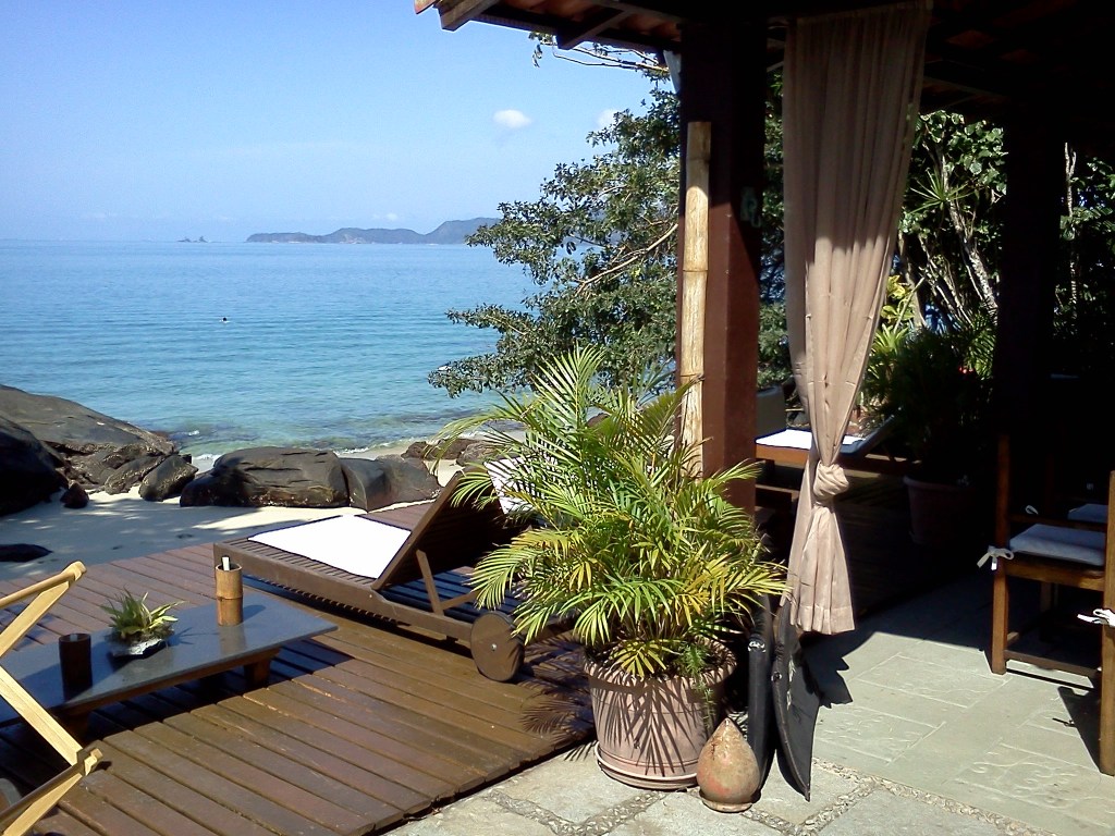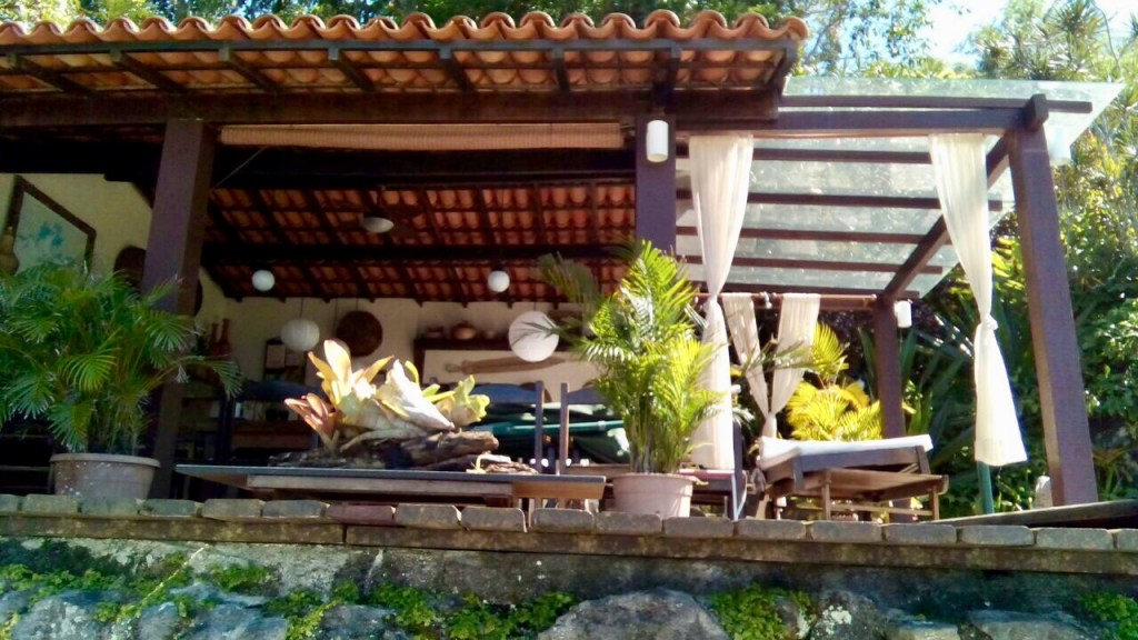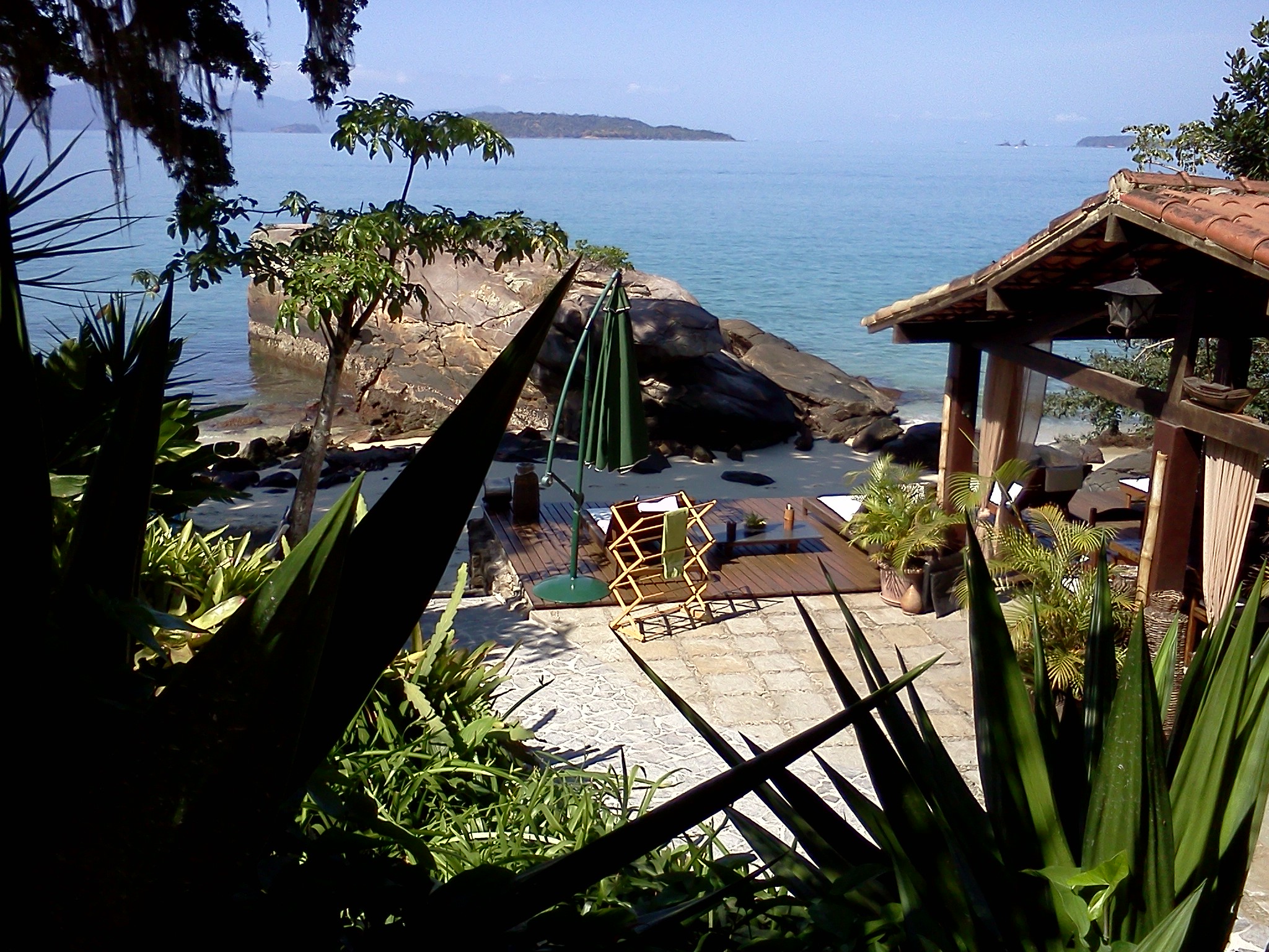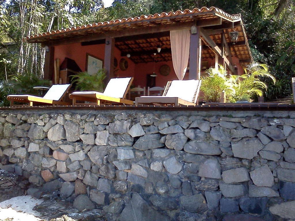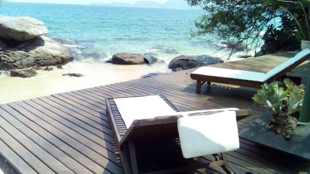 Em frente à churrasqueira, um deck sob a praia, com espreguiçadeiras e ombrelones.