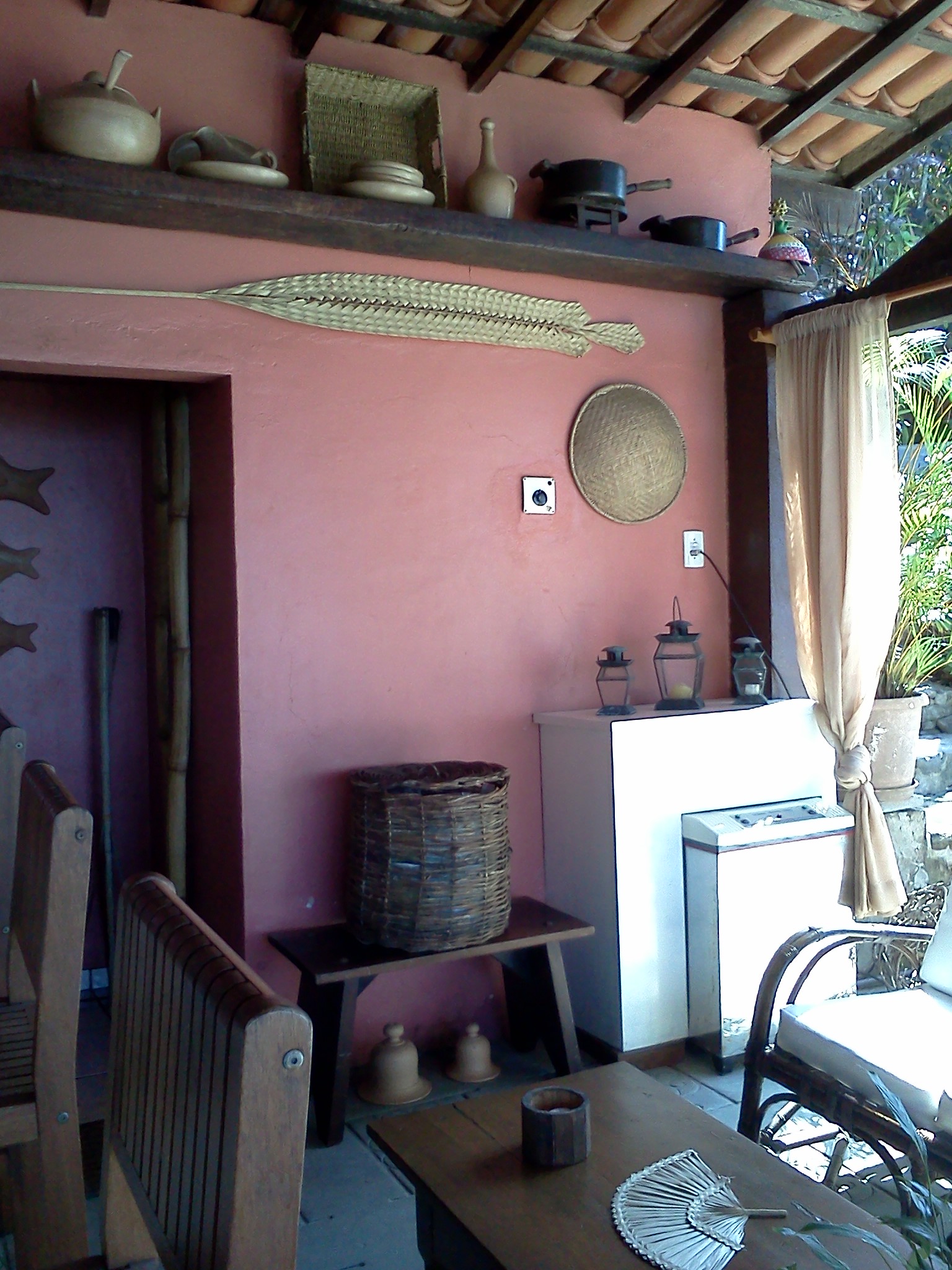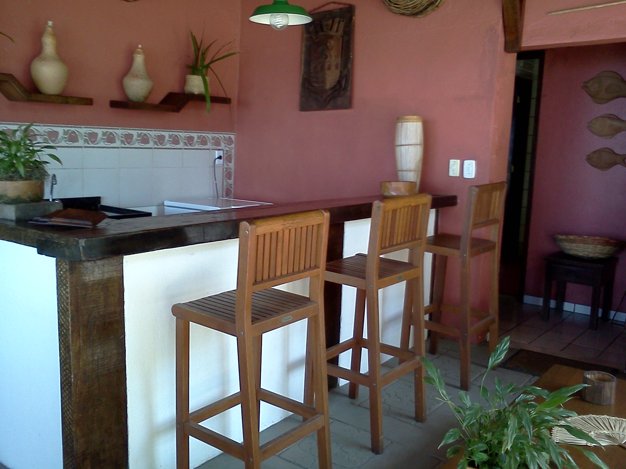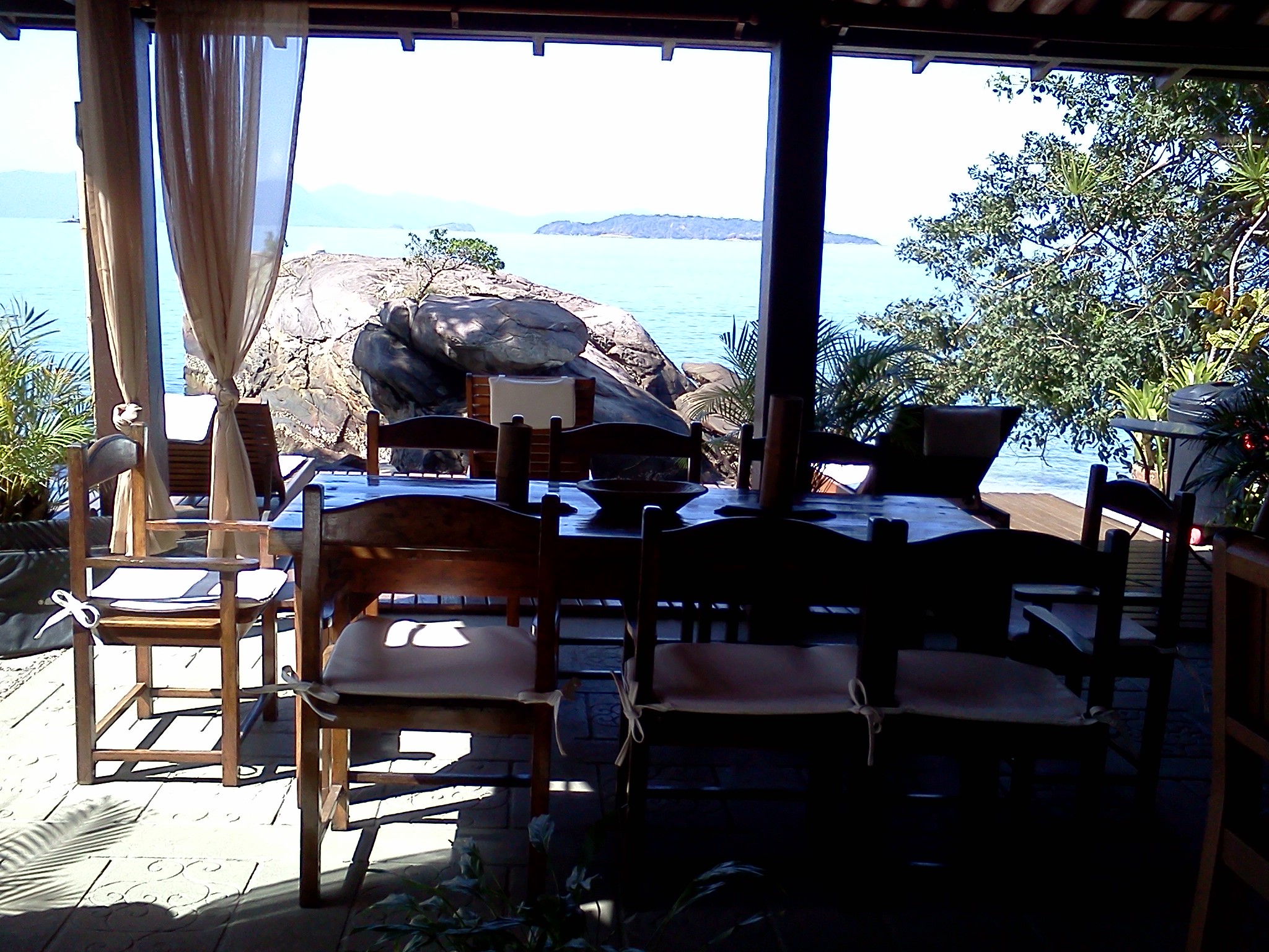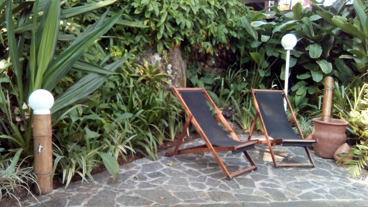 Em frente à churrasqueira, um deck sob a praia, com espreguiçadeiras e ombrelones.